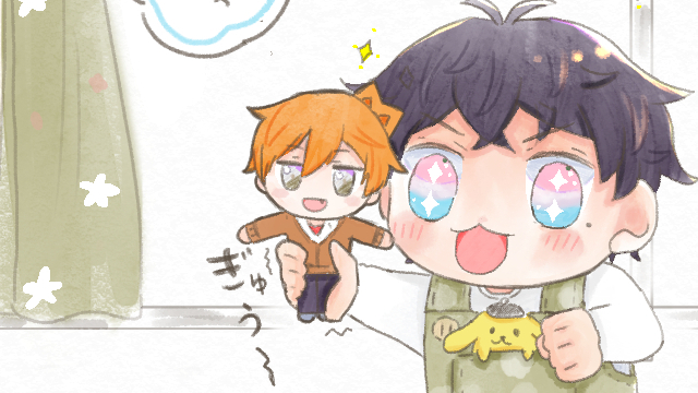 FanArtささみゃー042 FanArt/ささみゃー 2025.09.28 ちびっこみゃーちゃんを描きましたMのぬいぐるみをみゃーママに自慢しているようですMぬいとポムぬいは、みゃーちゃんのポッケの座を奪い合う仲だそうです(みゃーちゃんは一番お気にのぬいを胸のポッケに入れている、という設定を考えるのが楽しかったです) ・if幼馴染パロです↓ ・ぬい食うみゃーちゃん↓ asari